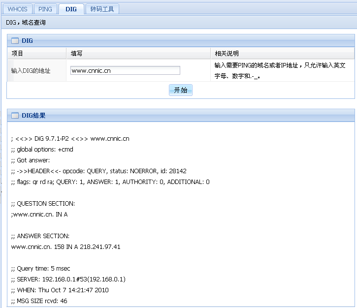 在文本框中输入需要DIG查询的域名或者IP地址,然后提交查询,稍微等候,就会出现查询结果信息。